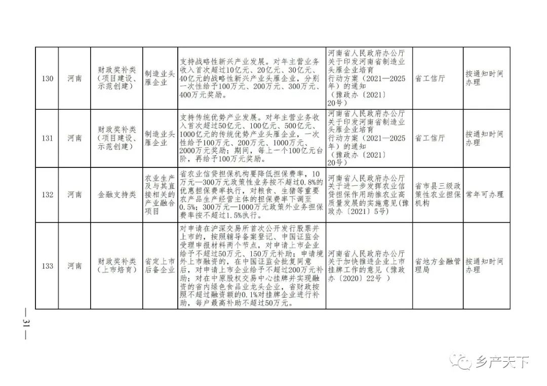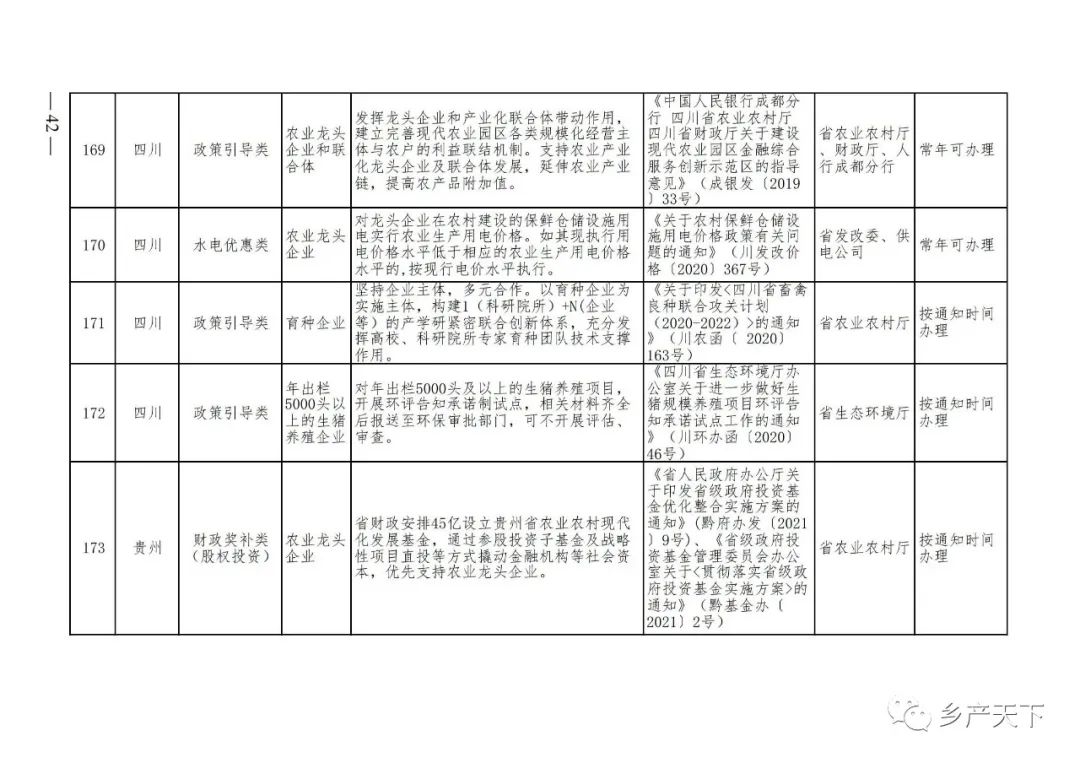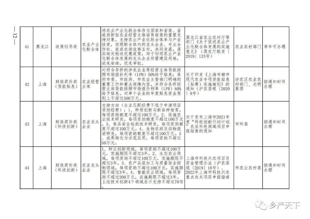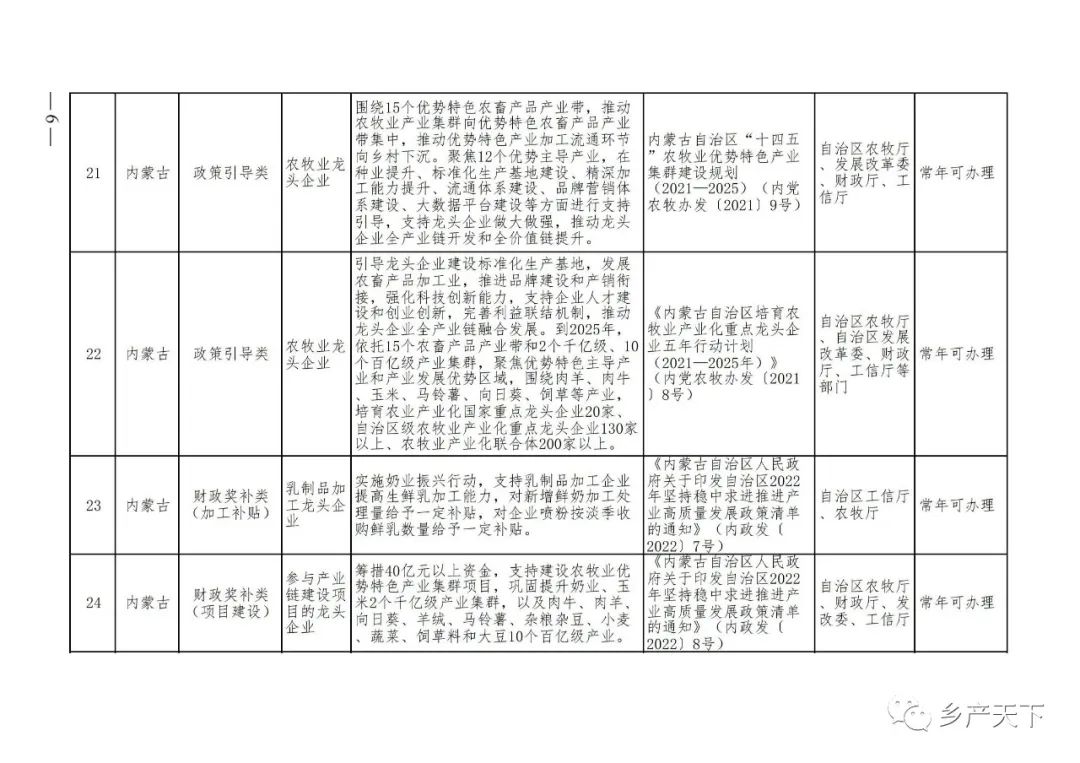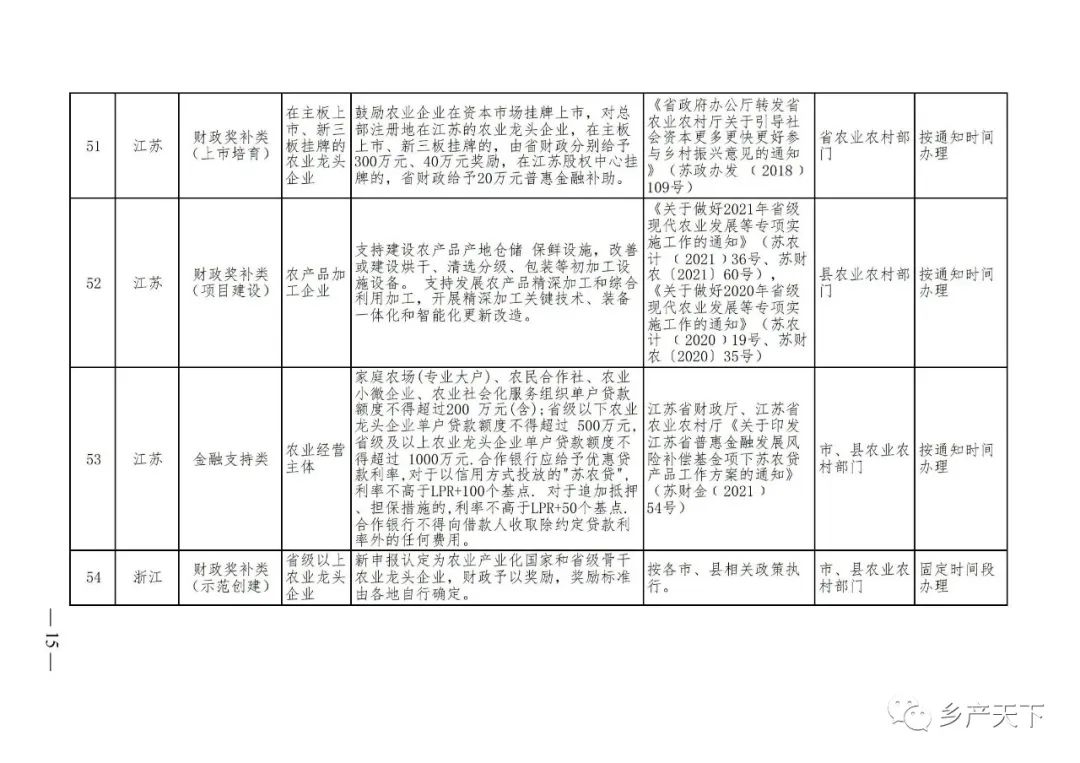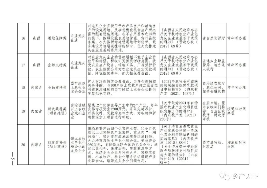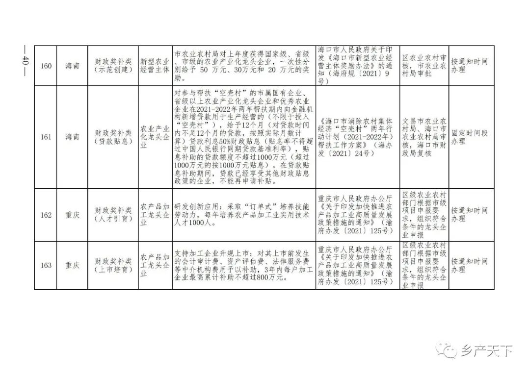 為加強對農(nóng)業(yè)產(chǎn)業(yè)化龍頭企業(yè)的精準服務(wù),農(nóng)業(yè)農(nóng)村部鄉(xiāng)村產(chǎn)業(yè)發(fā)展司收集了各省(區(qū)、市)對龍頭企業(yè)的支持政策,于近期印發(fā)《農(nóng)業(yè)產(chǎn)業(yè)化龍頭企業(yè)支持政策清單》(簡稱《清單》),供各地互相參考學(xué)習(xí)。