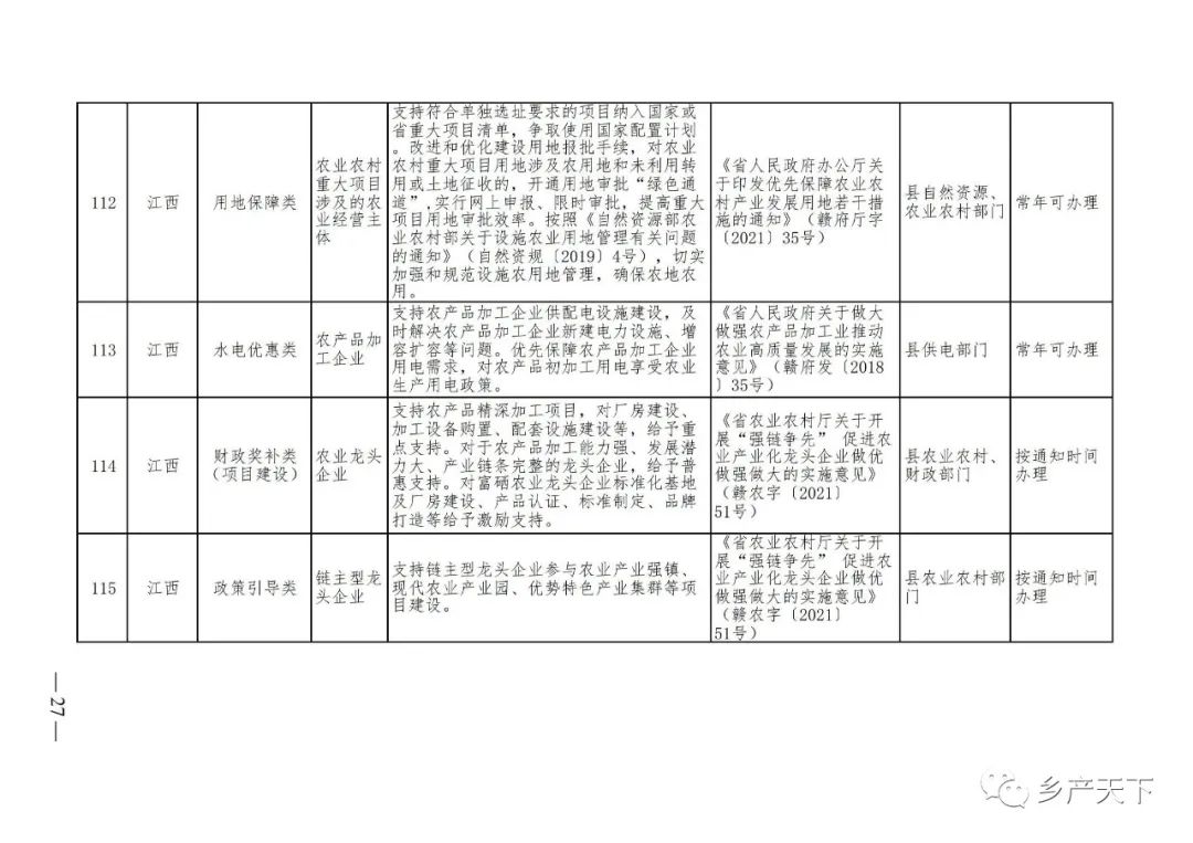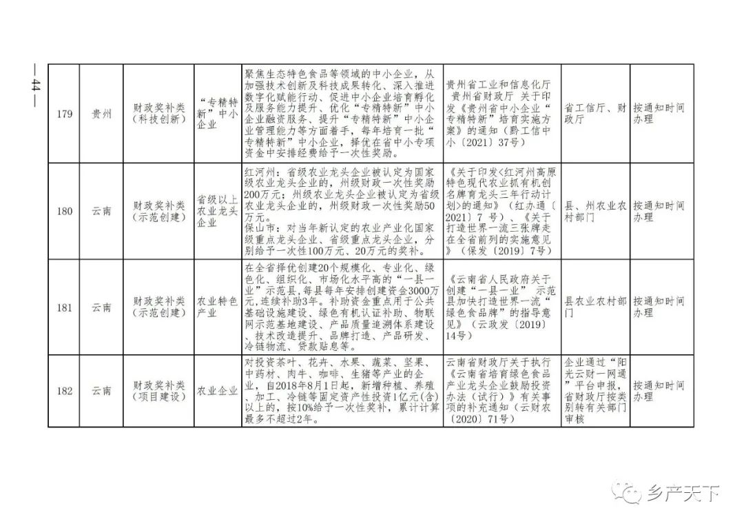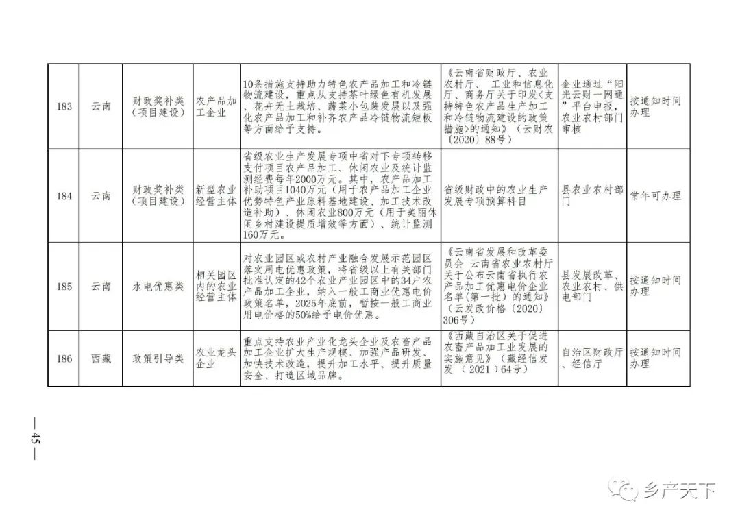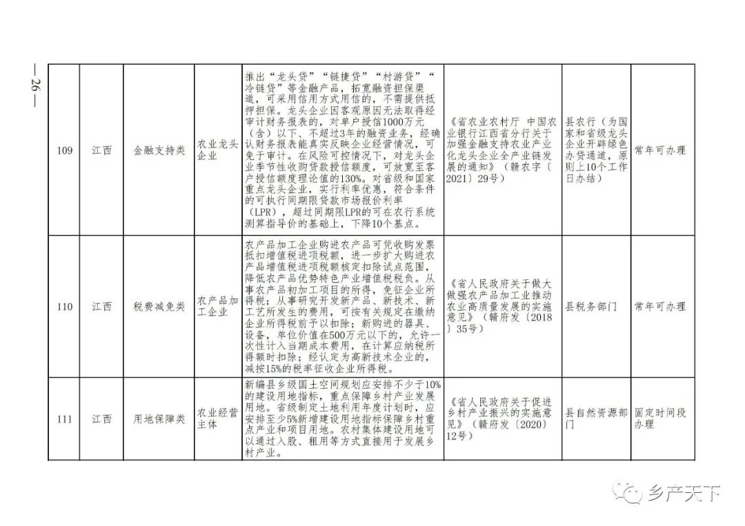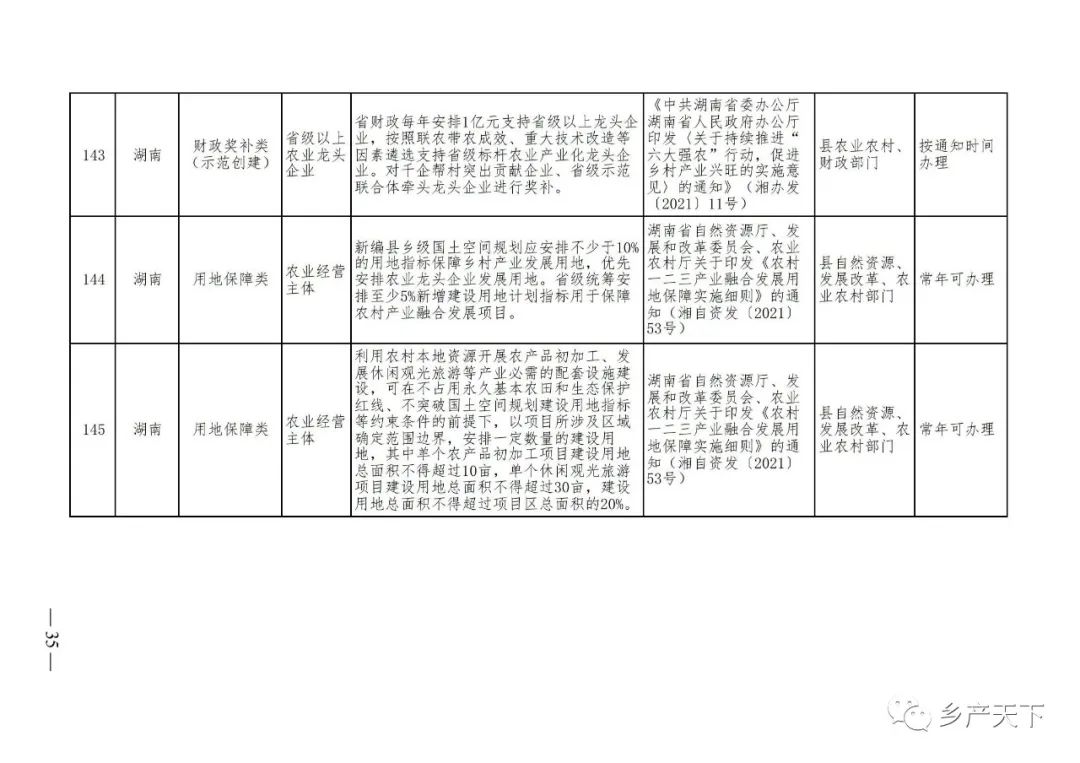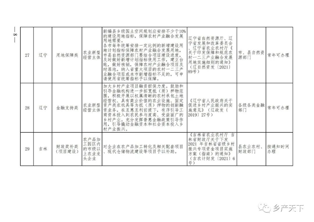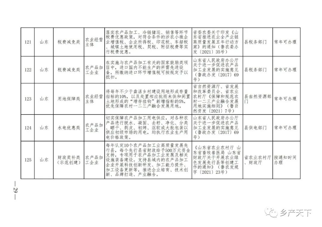 《清單》按照“政策類別、支持對象、具體內(nèi)容、政策依據(jù)、辦理部門、辦理時間”進行梳理,共涉及“財政獎補、金融支持、用地保障、稅費減免、水電優(yōu)惠、政策引導(dǎo)”等六大類229條政策。《清單》通知,各地支持政策發(fā)生變化,要及時反饋,鄉(xiāng)村產(chǎn)業(yè)發(fā)展司將定期更新發(fā)布。