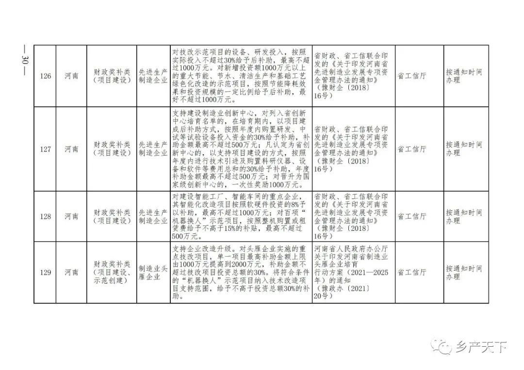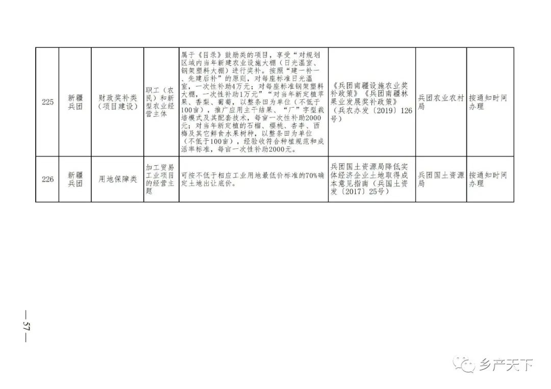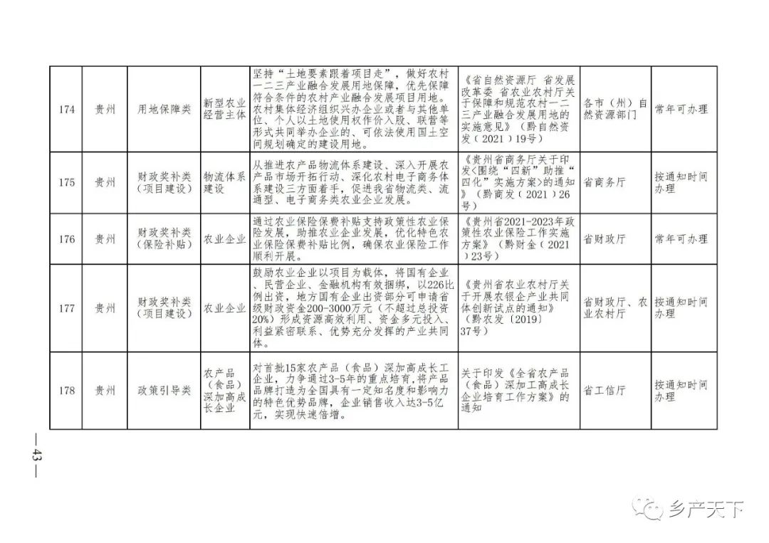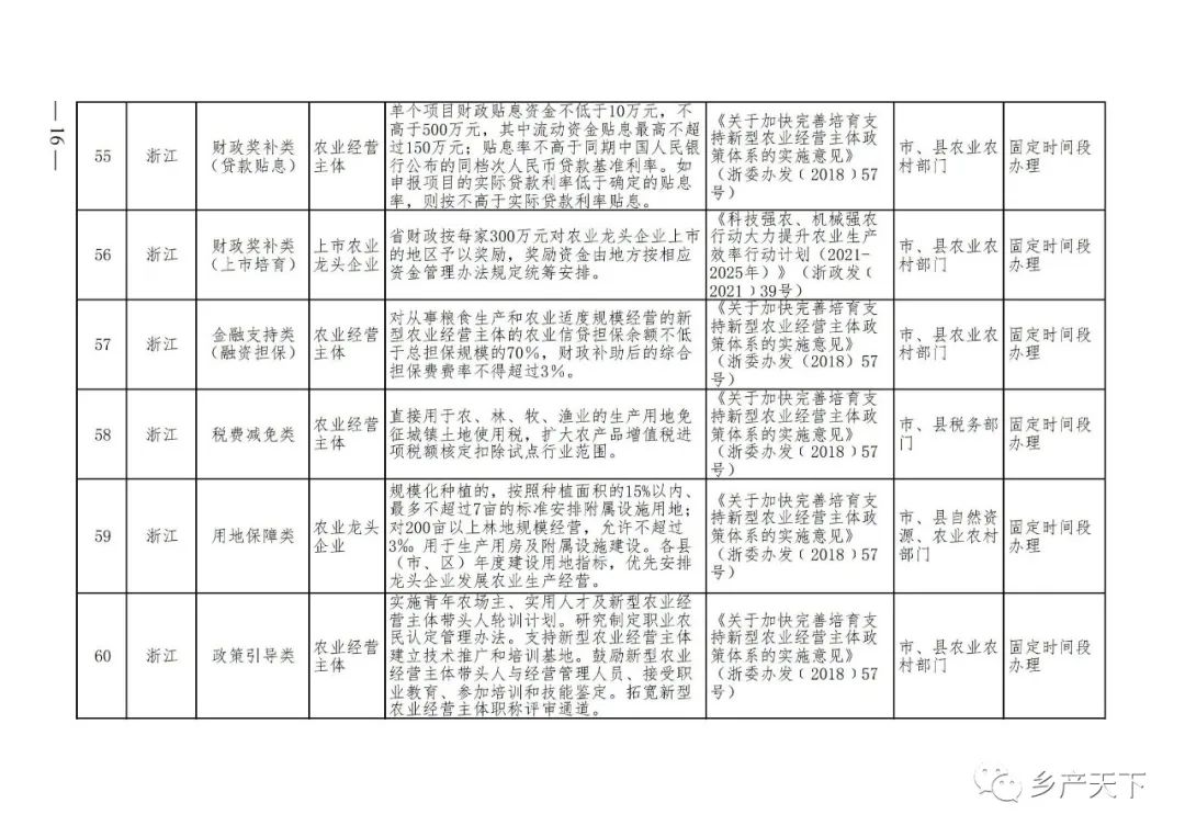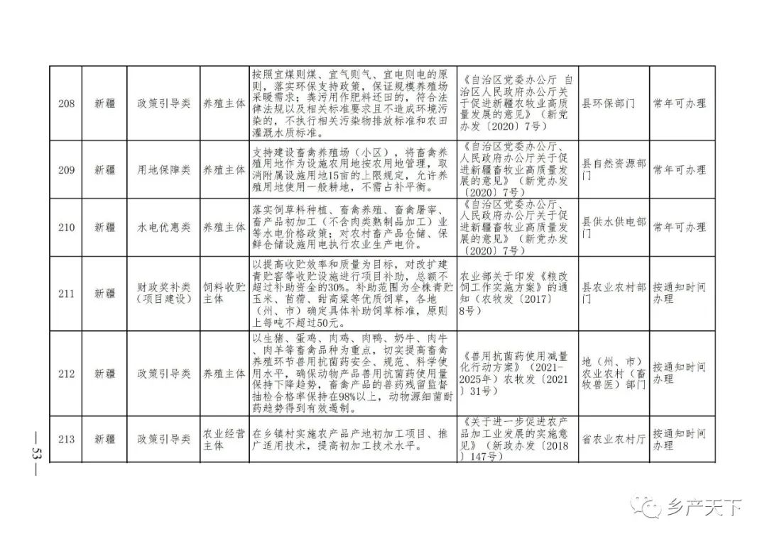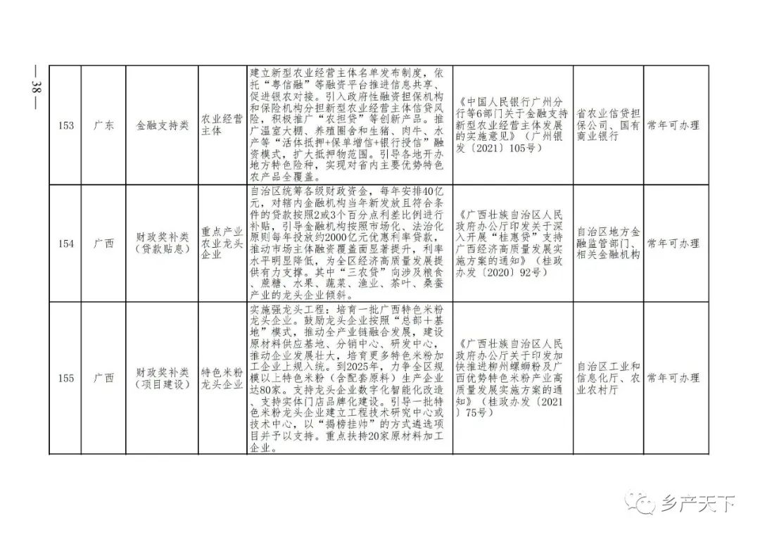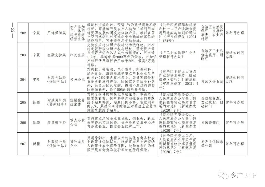 《清單》按照“政策類別、支持對象、具體內(nèi)容、政策依據(jù)、辦理部門、辦理時間”進行梳理,共涉及“財政獎補、金融支持、用地保障、稅費減免、水電優(yōu)惠、政策引導(dǎo)”等六大類229條政策。《清單》通知,各地支持政策發(fā)生變化,要及時反饋,鄉(xiāng)村產(chǎn)業(yè)發(fā)展司將定期更新發(fā)布。